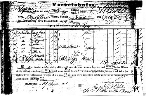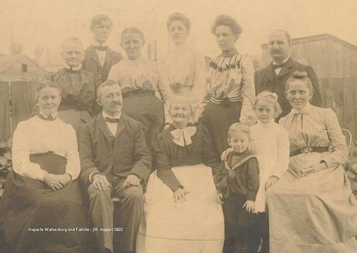 and accompanied by her 6 daughters. They came from Genthin-Altenplathow (East-Germany). Auguste's oldest son Wilhelm Wahrenburg was the only member of the family who stayed in Germany. He was engaged and married Friederike Führ on October 8, 1871 - as soon as he had received a telegram that his mother and sisters had well arrived in the "New World". |